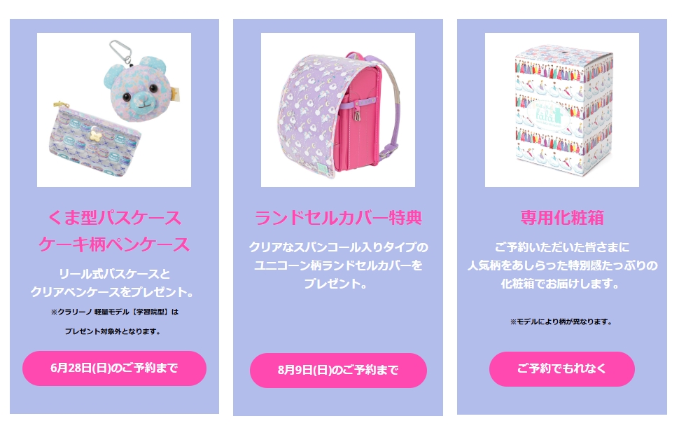 期間限定ですが、予約するともらえるランドセルカバー等も人気です。
